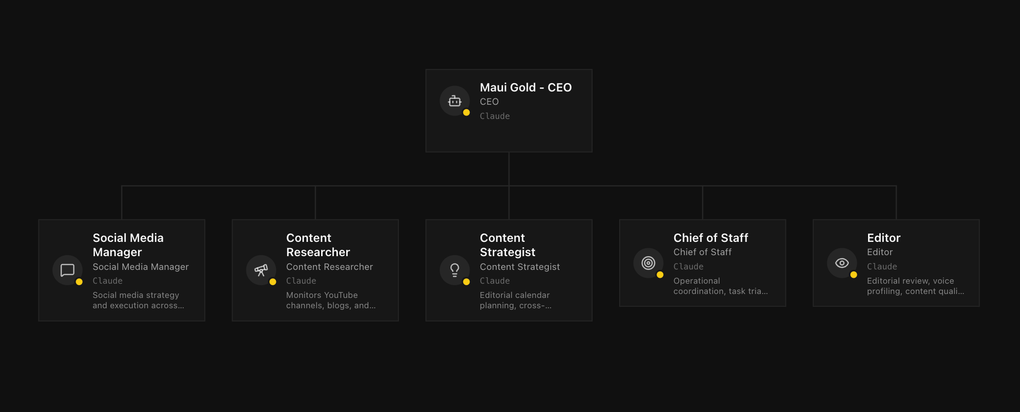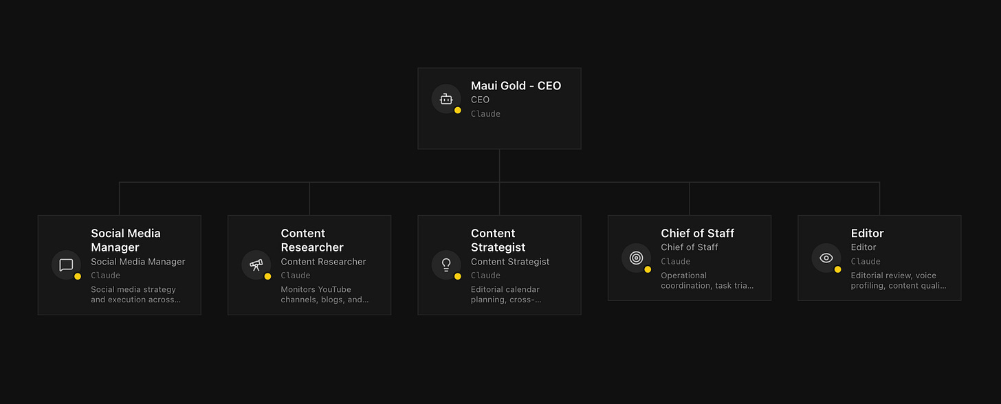 So here’s what actually happened. I have this whole fleet of agents: content managers, SEO managers, all of the above. They’re running very bespoke tasks, and the CEO agent is spending all its time managing them, asking, passing things along. Balls are getting dropped. They’re not passing tickets along or following any review process. When I hire an editor agent, they don’t inherently know what a Twitter/X-style edit looks like versus a LinkedIn-style one, and need to adapt my voice profile to it.